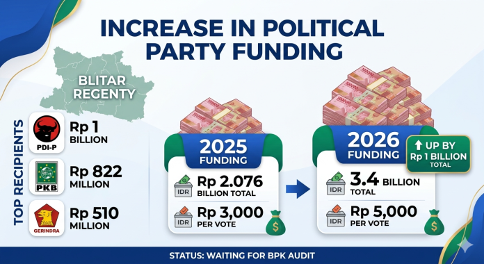 The increase comes after the value of political aid per valid vote rose from Rp 3,000 to Rp 5,000. The adjustment followed a recommendation from the governor and a proposal from the Blitar Regency Legislative Council (DPRD).