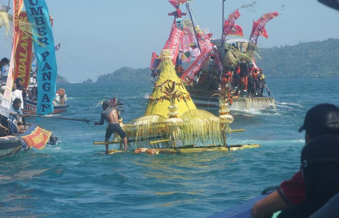 The highlight of the event was the floating of the buceng agung, a giant cone-shaped offering filled with crops and a buffalo head. Organizers carried it from the fish auction port at Prigi Harbor and transported it by motorboat into the open sea.