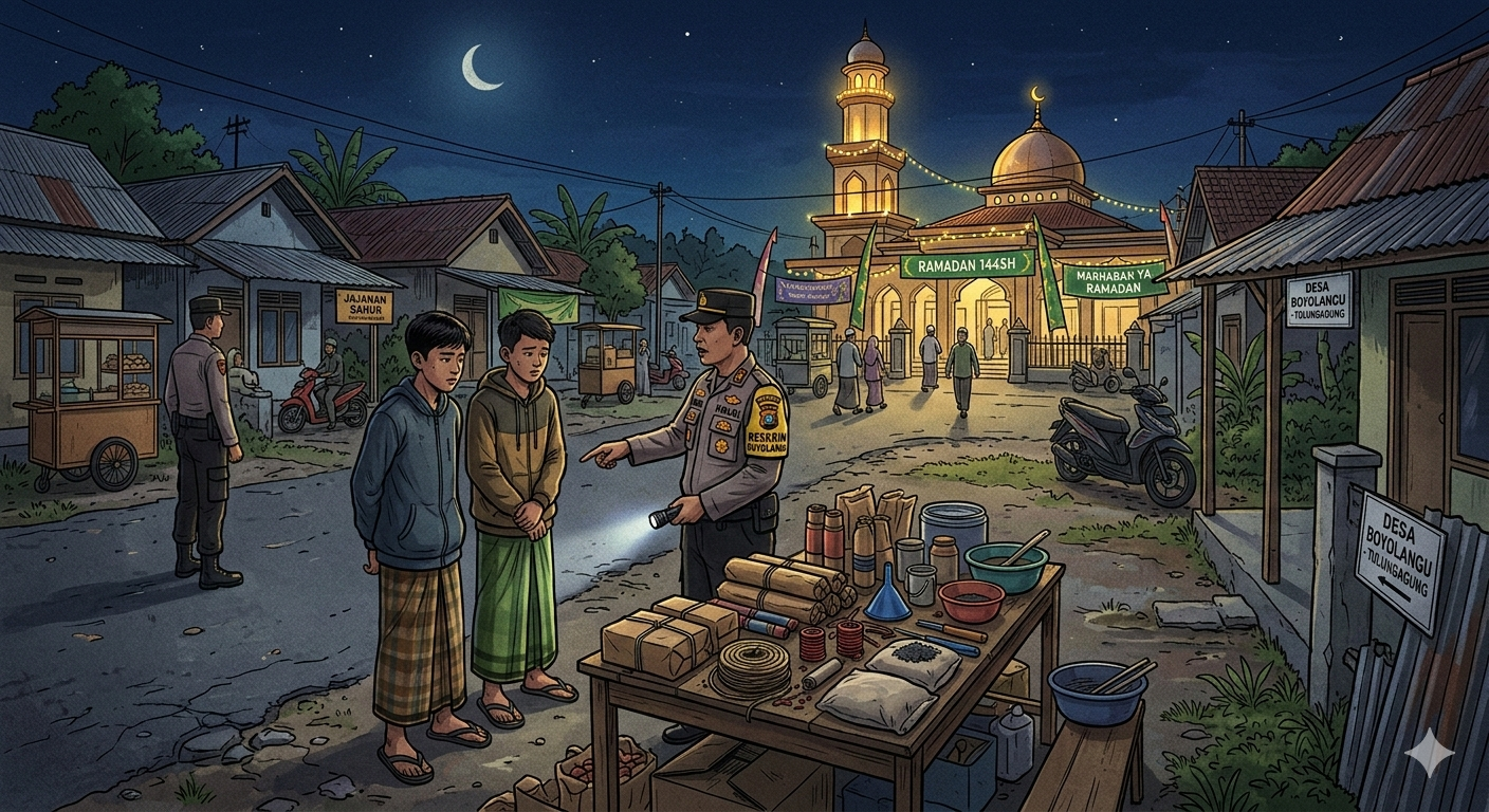 TULUNGAGUNG – The firecracker case in Boyolangu, Tulungagung, has escalated after police detained two teenagers. Officers also uncovered explosive materials at a suspect’s home during Ramadan patrols.